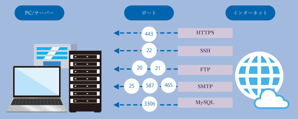 ポート番号とはネットワーク内の住所であるIPアドレスを建物に例えるならば、部屋番号がポート番号です。ポート番号は0~65535番までありますが、0~1023番までは特定のサービス専用として予約されていて、「ウェルノウンポート」と呼ばれています。それ以外にも「登録済みポート」が1024~49151番迄、「ダイナミックポート」が49152~65535番までとなっています。「ダイナミックポート」は一時的な通信のために自由に割り当てられます。