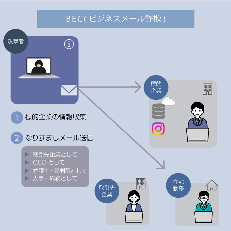 ビジネスメール詐欺 ( BEC: Business Email Compromise )とは、企業をターゲットとしたメールを使った情報収集詐欺の一種で、世界的に増加傾向にあり、日本国内でも巨額の損害が報告されています。特にその中でも2025年12月以降に急増したCEO詐欺(CEOなりすましビジネスメール詐欺)に関しては、たった数か月で億単位の被害が報告されています。 ビジネスメール詐欺 は主にソーシャルエンジニアリングで人の心理的な思い込みや隙を悪用して巧妙に目的を果たす手段ですが、その中でも偽の身分や状況を装う「プリテキスティング」という非技術的な手法に、PC・サーバーやインターネットの技術を用いた手法を組み合わせた複合的な詐欺の手口です。